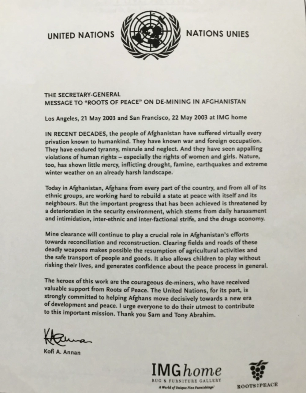 The objectives of the U.S. Humanitarian Demining Program and the work that organizations such as Roots of Peace does, directly or indirectly, advances national reconciliation and social stability in crisis-affected areas such as Afghanistan and Croatia – the latter another landmine “adoptee” of Roots of Peace.